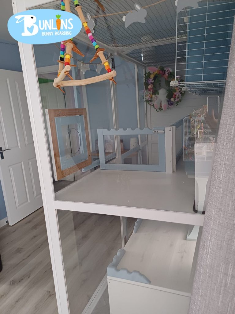 The enclosure measures 2 metres x 1 metre, made of wood and perspex so your bunnies can feel involved with the room around them.